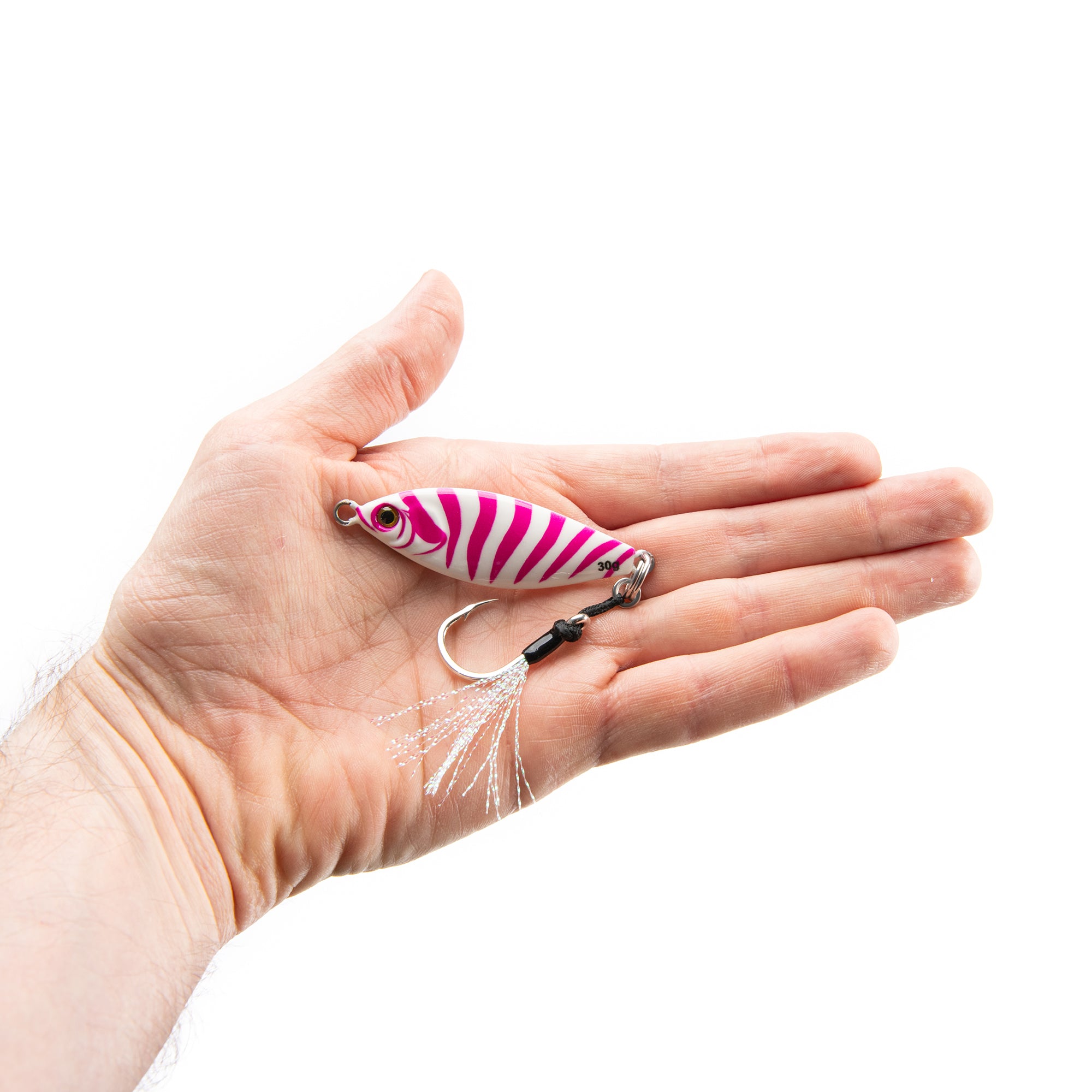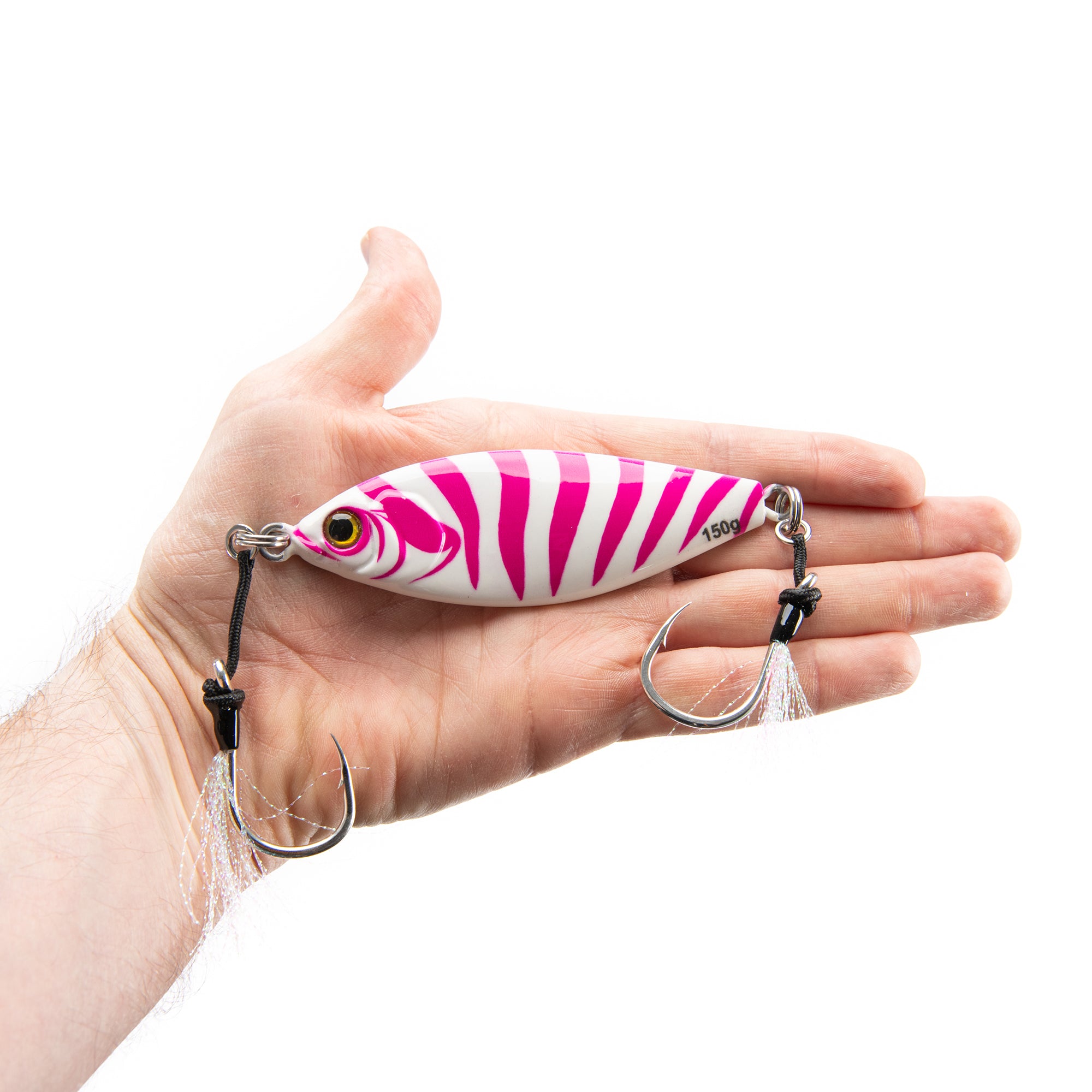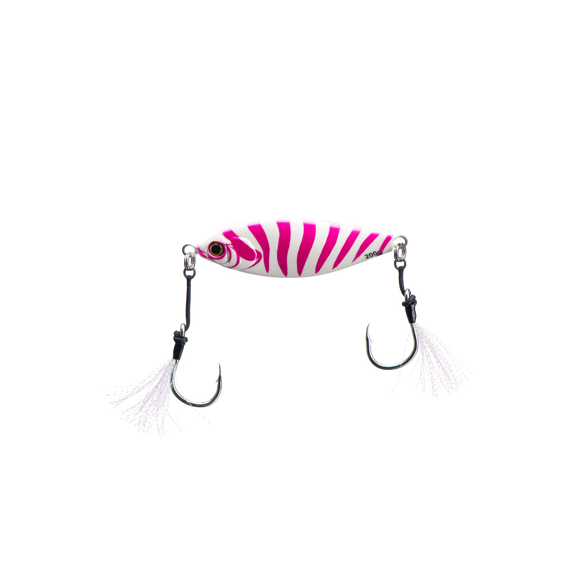 Fluorescent pink paired with glowing white tiger stripes creates a bold attractor pattern predators can see from a distance. It flashes. It glows. It demands attention on the drop.